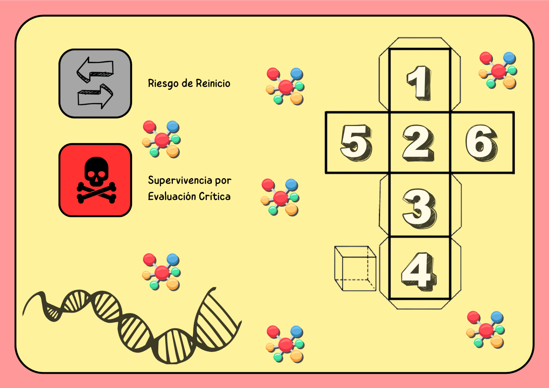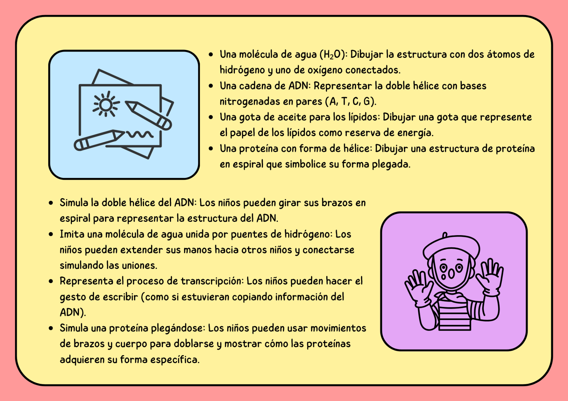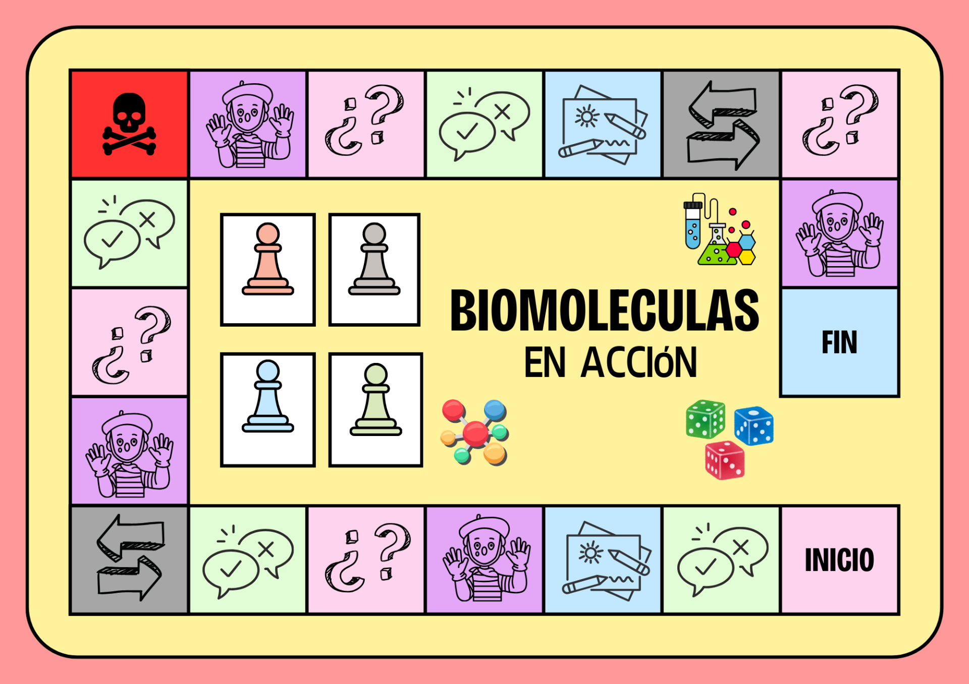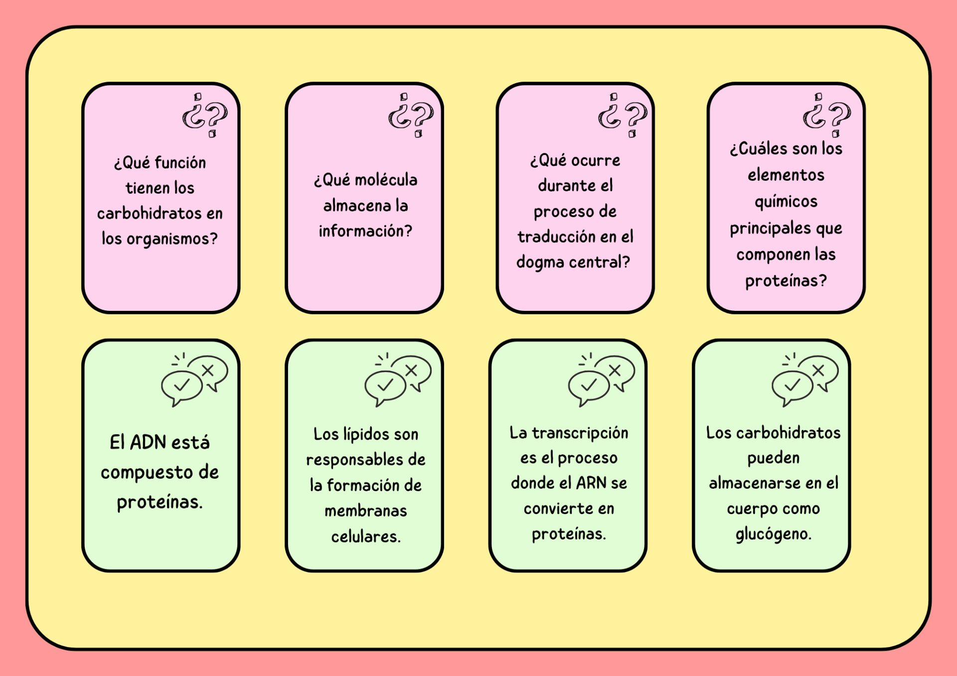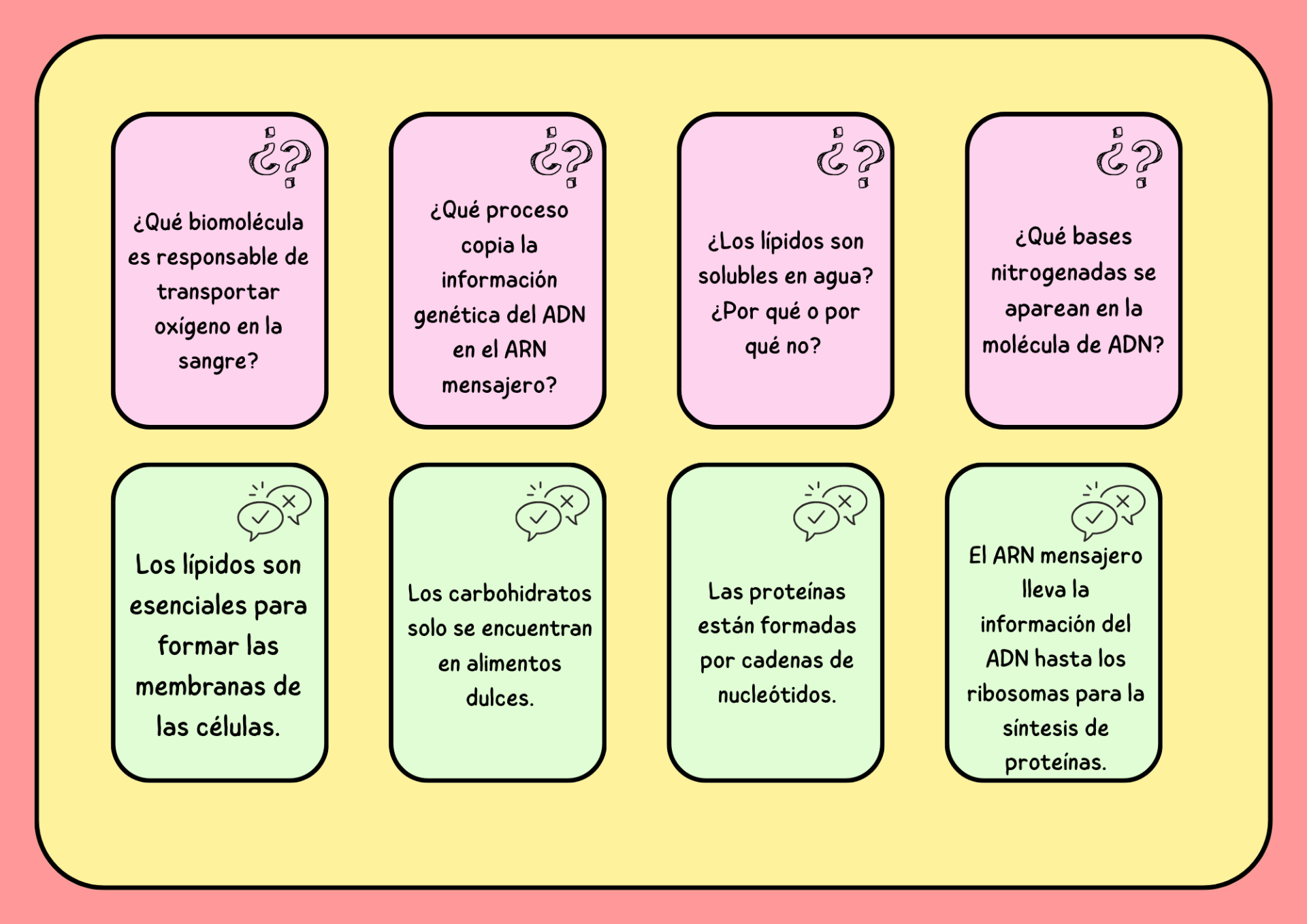- Casilla rosa (Preguntas): De manera colaborativa, el equipo responde preguntas sobre biomoléculas y el dogma central.